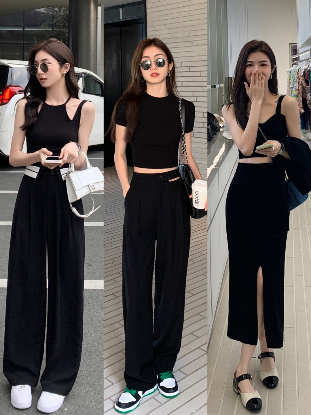 在夏天穿這種高腰的黑色闊腿褲時,往往都會擔心顯得沉悶,那麼你在搭配時可以用一些短款上衣去匹配,既能夠分割你的比例,又能夠幫助打造出簡約隨性的氣質。穿衣服的時候還可以嘗試合適的露腰方式來營造出性感肌膚,時尚度非常高,也會覺得沒那麼厚重。