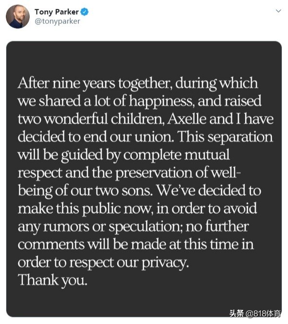 帕克在社媒上發布聲明:「共度了9年快樂時光,我們分享了很多快樂時光,並共同養育了2個可愛的孩子後,Axelle和我已經決定結束我們的關係。這是彼此尊重的決定,也是為了保護兩個兒子。我們現在決定公開是為了避免任何流言或揣測,為了尊重我們的隱私,未來不會再評論此事。謝謝。」