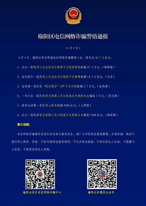 4月4日,榆陽警察分局接電信網路詐騙警情6起,提失達38.7萬餘元