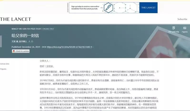 國際醫學期刊《柳葉刀》(The Lancet)於26日在其官網以中文形式發布了一篇大陸學者的文章——《給父親的一封信》。