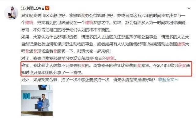 江一燕被網友扒出,作為「夢想的家」的疑似業主,只是提供了設計的意見和想法,就把自己放在設計團隊之首去國外領了獎,這不是搶專業設計師的功勞嗎?不僅專業領域人士不滿,就連網友也不淡定了:「如果僅提供想法就能獲得建築獎,那王石、潘石屹、王健林等豈不都是建築大師?!」後來,有網友還內涵這個「權威」的世界級建築獎項其實是個什麼集團設立的,時間不長,每年設立200個獲獎項目之多。