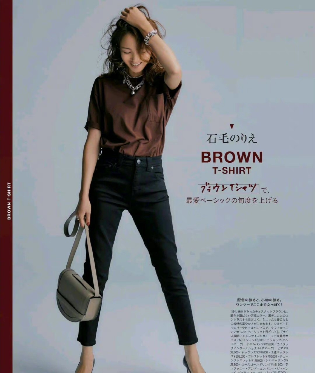 像這件褐色的T恤,它在搭配方面並沒有太多的約束,可以直接組合一條黑色長褲,用最簡單的兩抹色彩構造出自然且接地氣的穿搭。