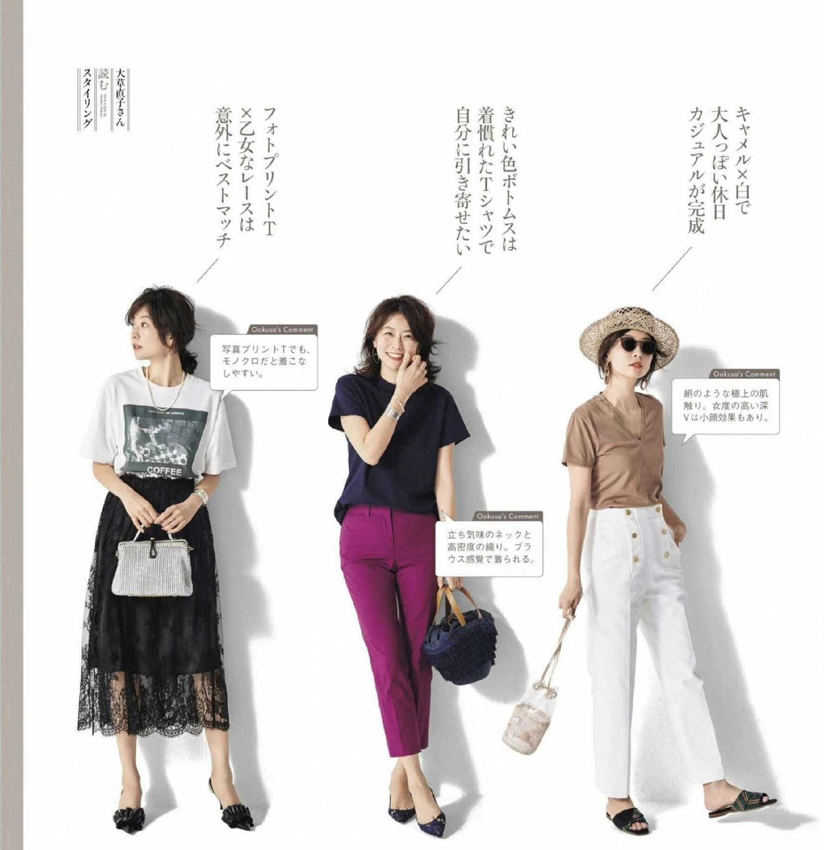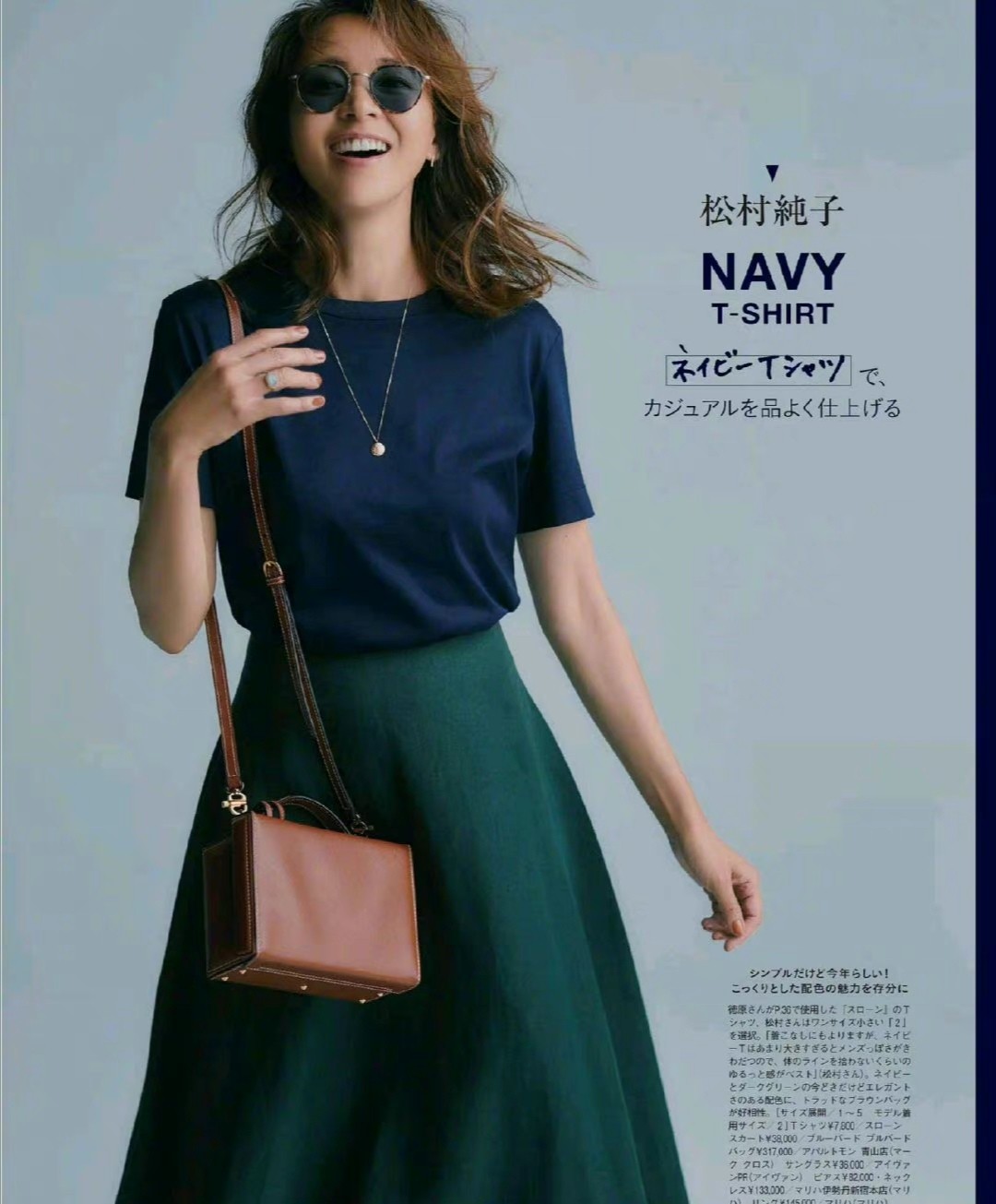 同樣採取T恤和深色的波點半裙結合,依舊以白色為主,可以發現這種配色方式格外的簡單,也不會挑人,就算過了四十歲之後,也依然適用,也依然能強化減齡效果,突出優雅魅力。
