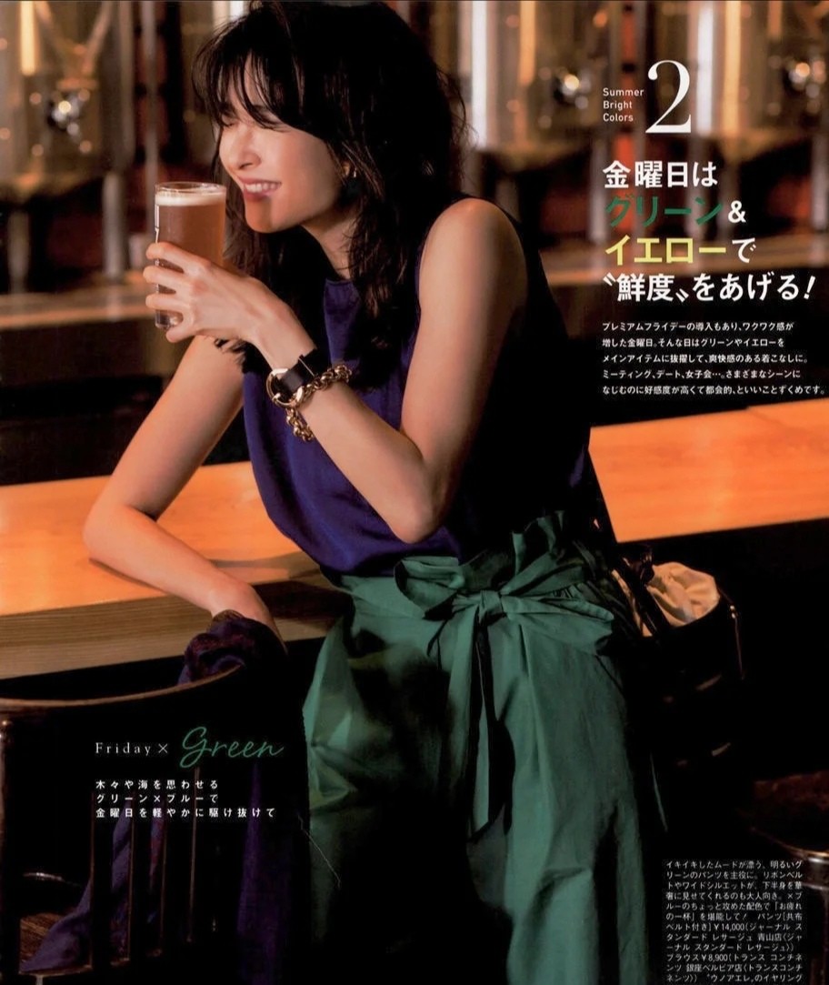 除了可以搭配墨綠色的半裙以外,也可以利用綠色的寬鬆褲裝呈現出率性的休閒感。這條褲子就能展現出更高的存在感,還有腰帶可以隨意地收縮出符合自身腰圍的褲裝尺寸,與無袖單品的結合更加清涼。