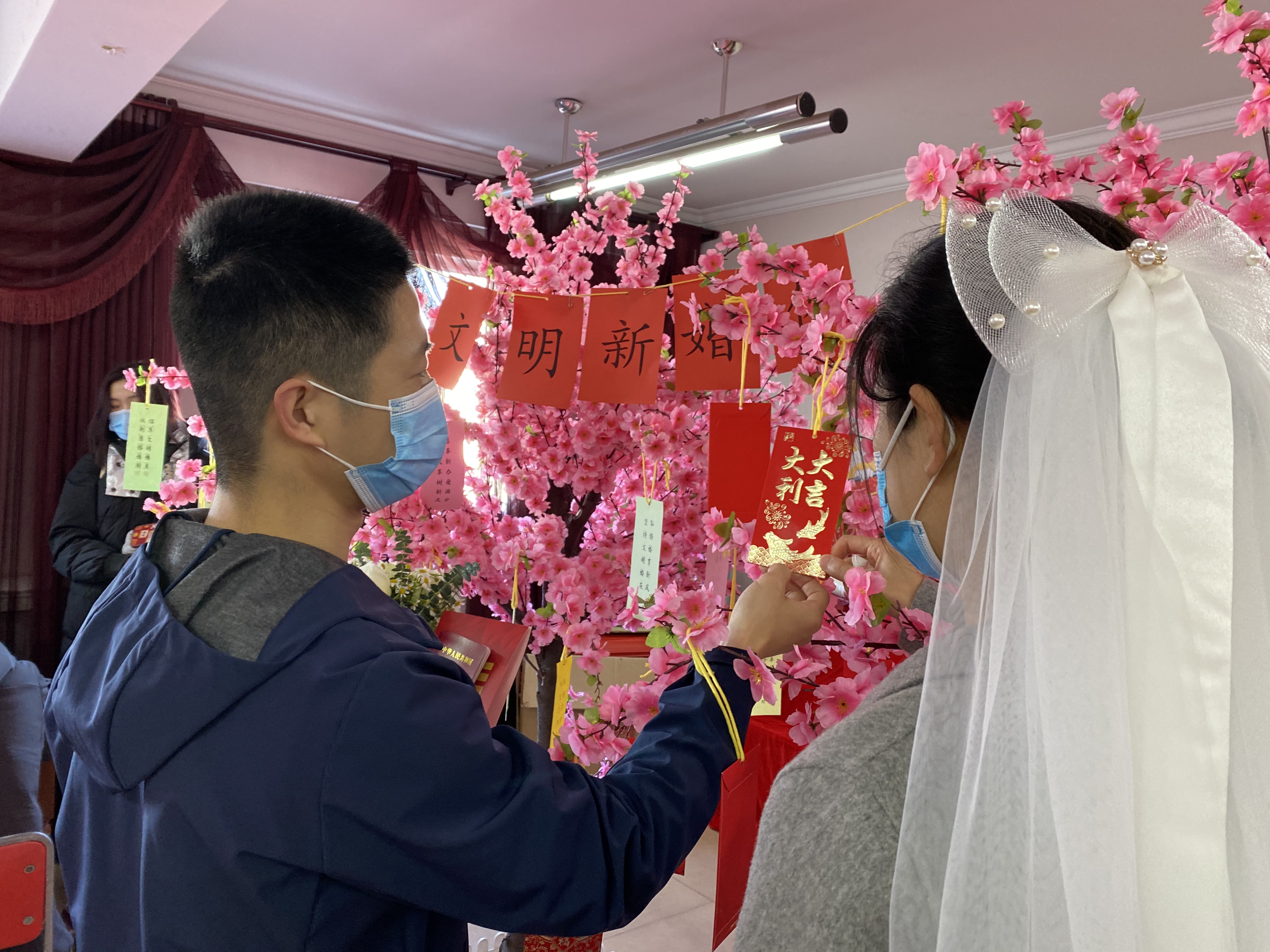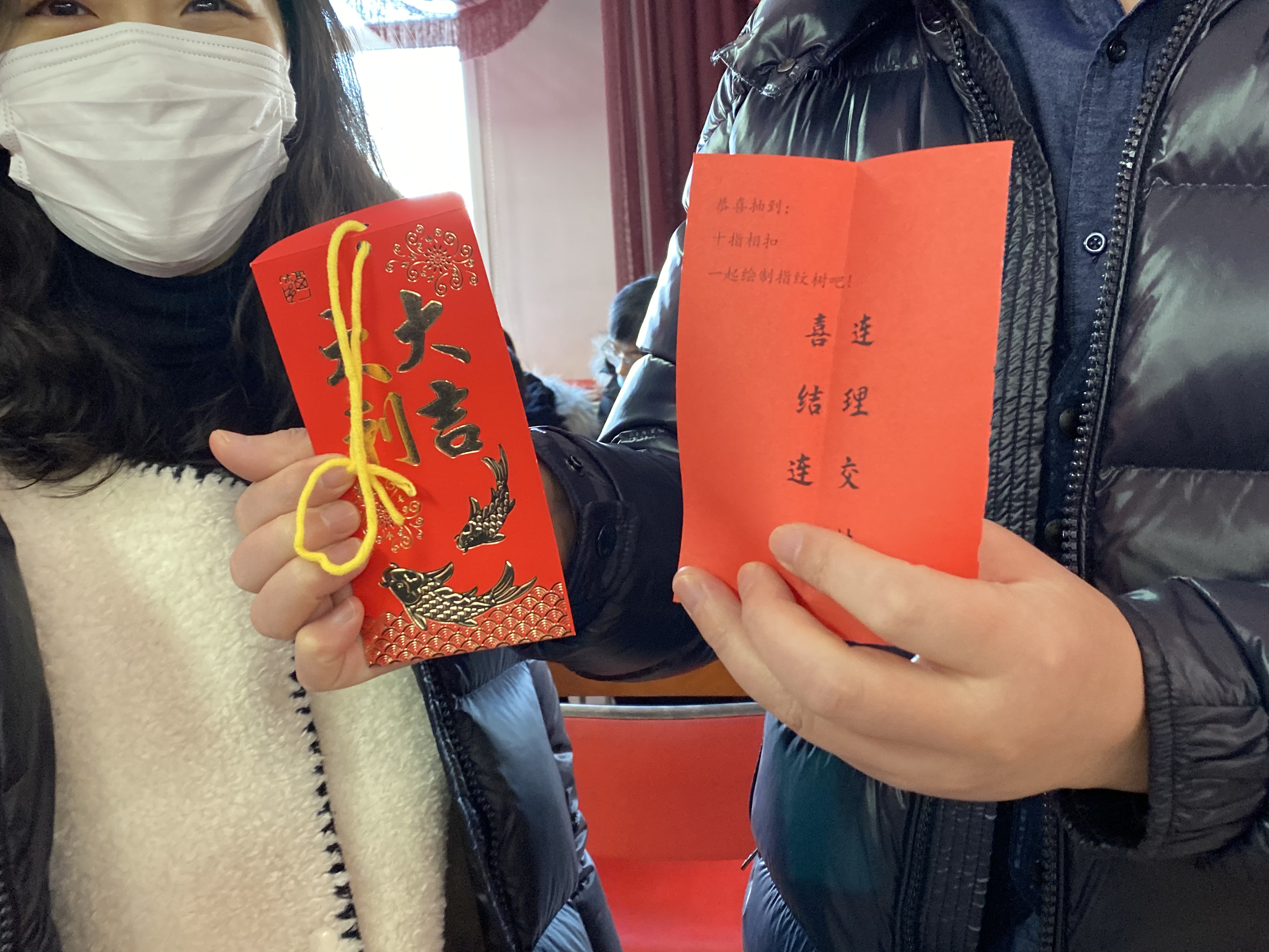 舉辦「緣來誓你,與‘2’相逢」主題活動,新人們通過互動問答、做手印畫、冬奧吉祥物剪紙等感受新婚的甜蜜。
