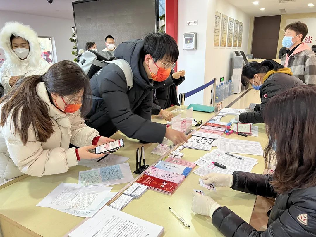 布置愛情許願樹,拉上象徵幸福的「20220222·幸福向未來」條幅,上面掛滿了紅色的彩綢。義工們專門擺臺發放「愛情銀行」存折,希望新人們能在今後的生活中收獲更多的愛。