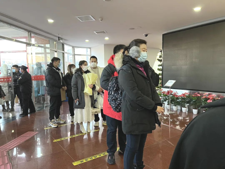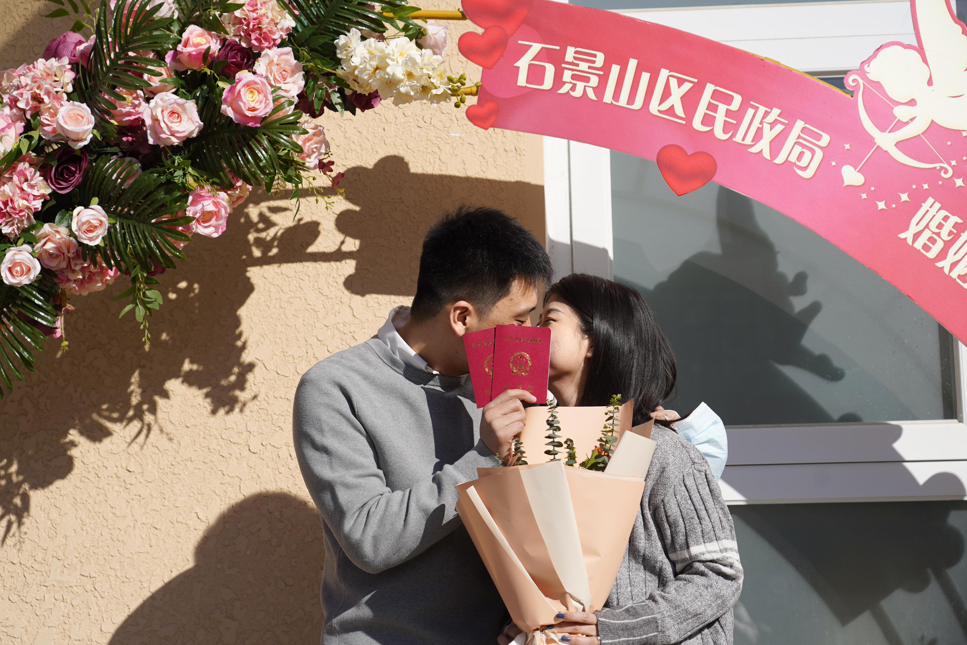 東城區民政局婚登大廳,預約領證新人保持「一米線」有序進行排隊登記