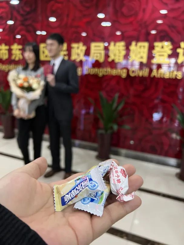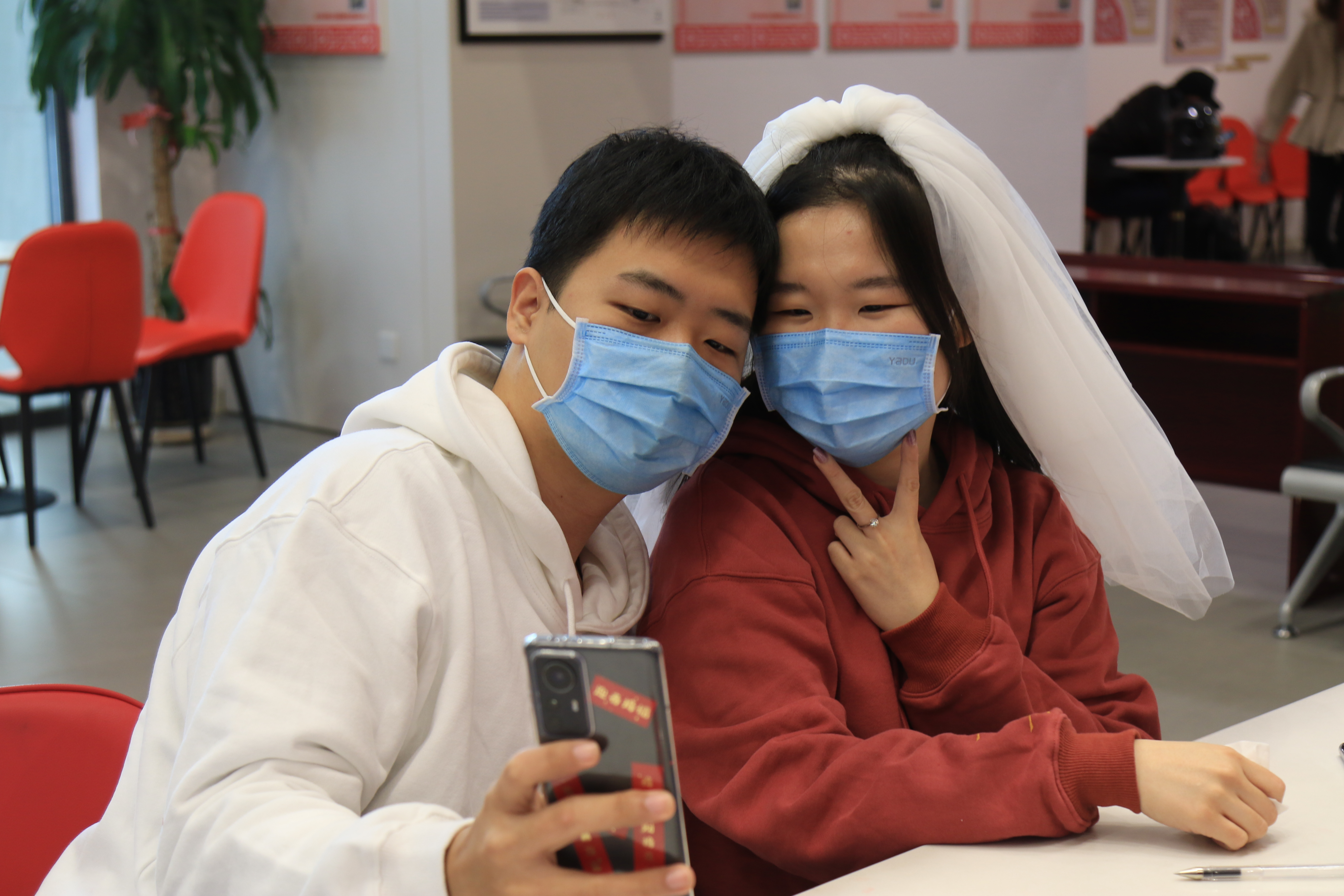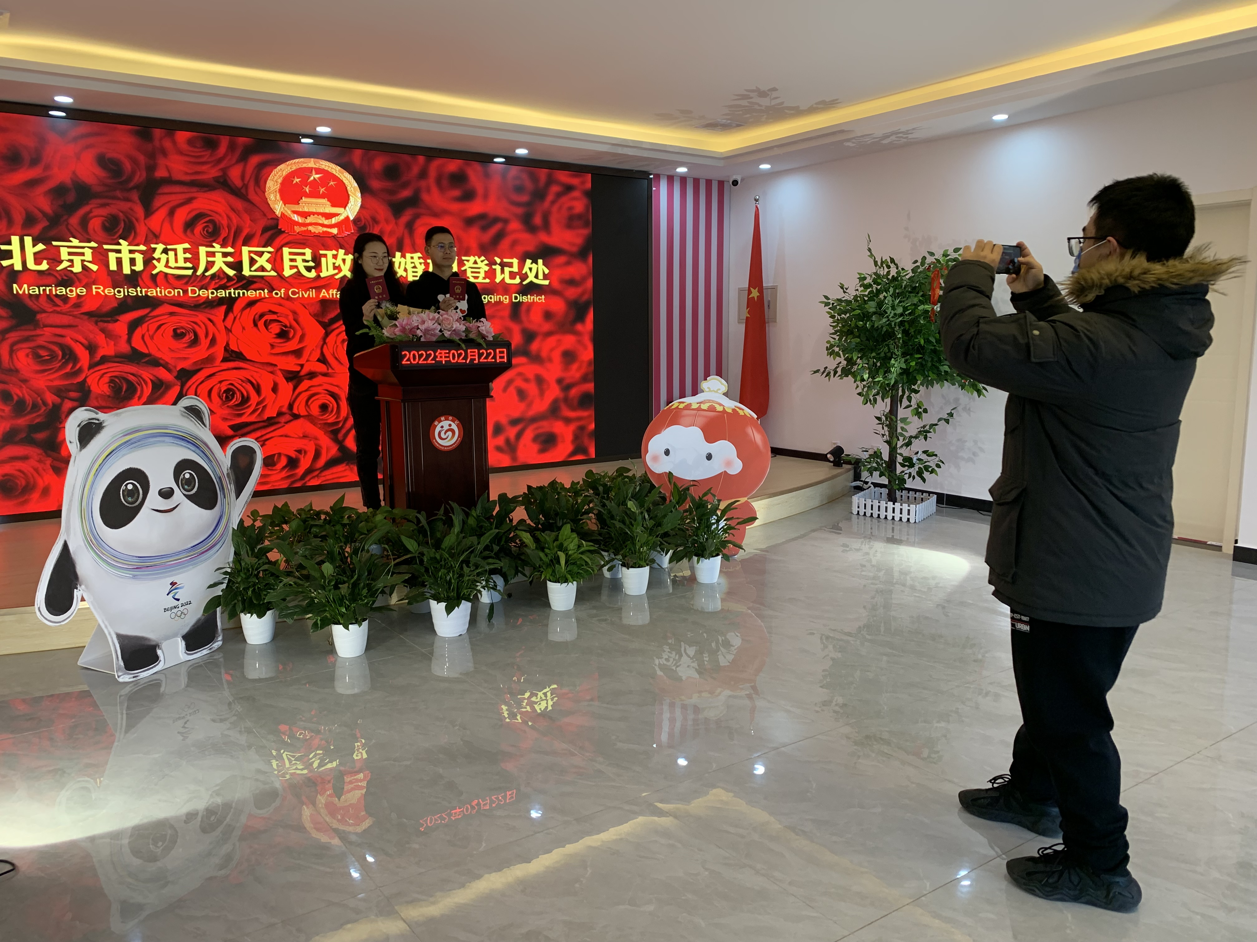 院內布置「婚俗文化牆」「冬奧文化牆」供新人拍照,可愛的「冰墩墩」「雪容融」受到了許多新人們的歡迎。