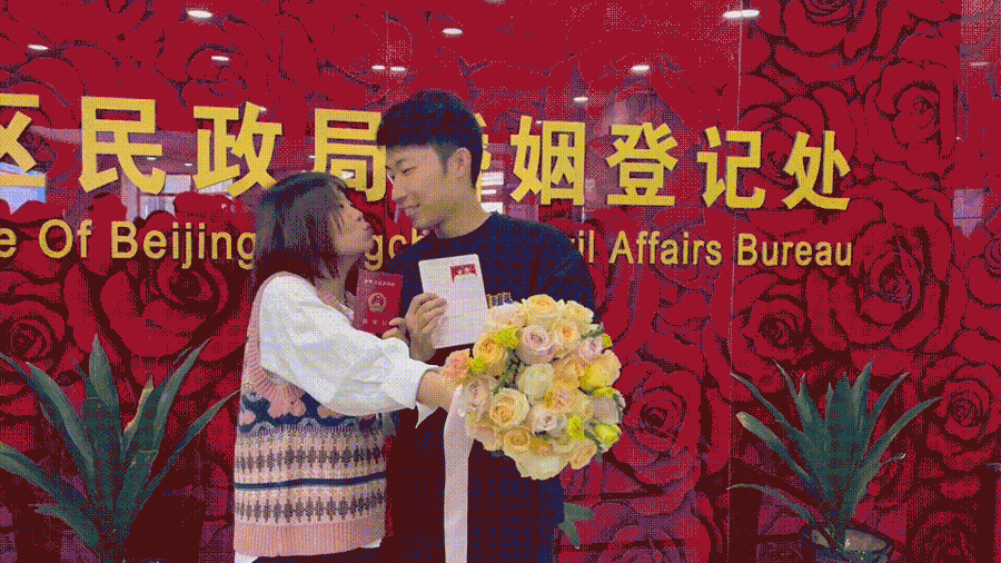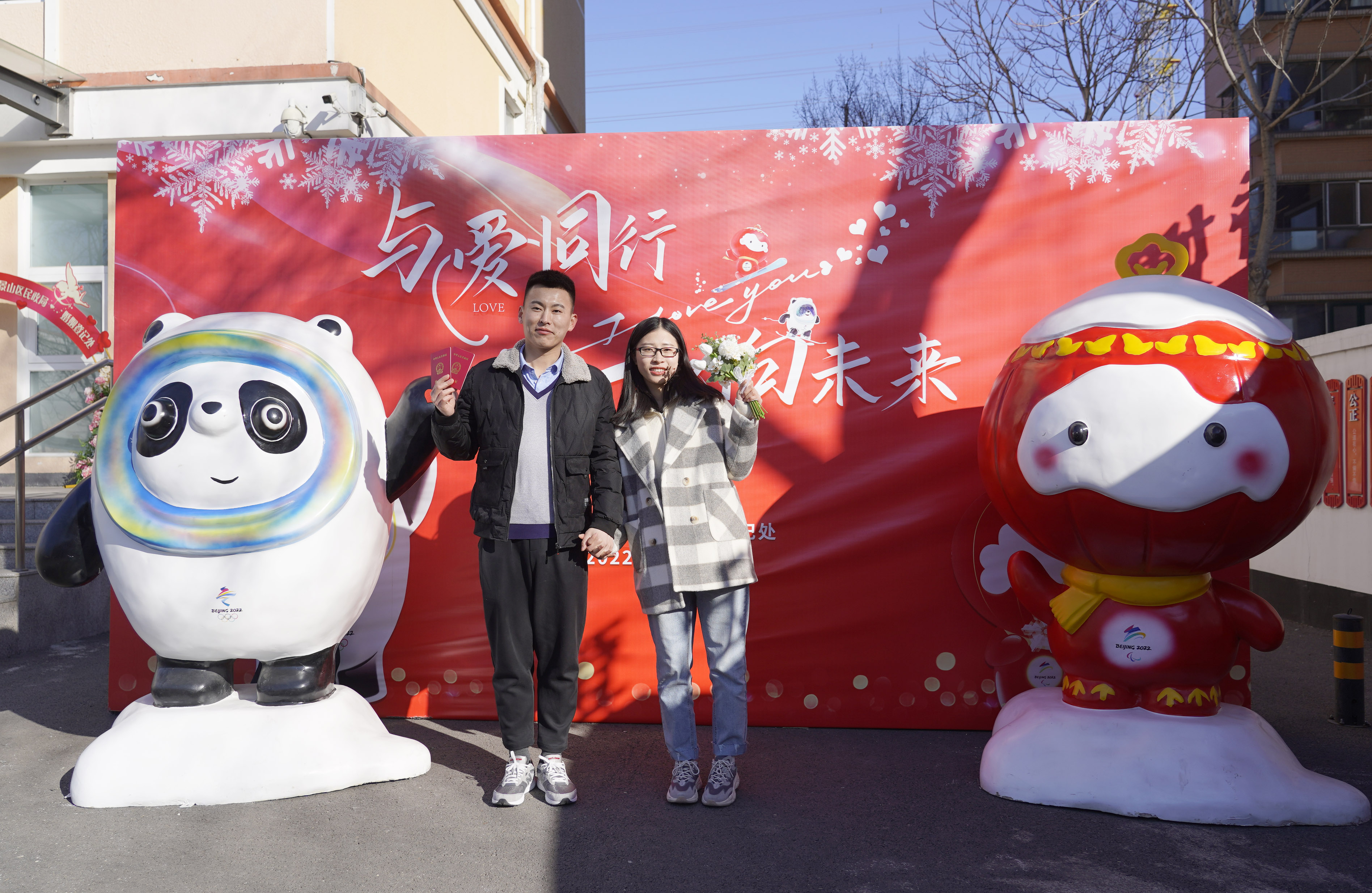頒證臺兩側擺放的冰墩墩、雪容融形象展板讓新人們感受到濃濃的冬奧氣氛。同時,新人還能享受「一站式婚檢」、婚姻家庭輔導等貼心服務。