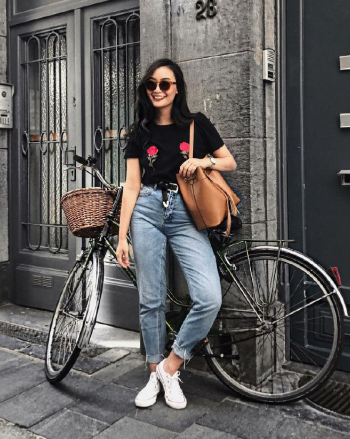 純黑色的T恤上面有紅色玫瑰刺繡圖案,這讓整件上衣看起來更有亮點,搭配了一條九分牛仔褲,腳上搭配純白色的平底運動鞋,十分適合逛街打卡。
