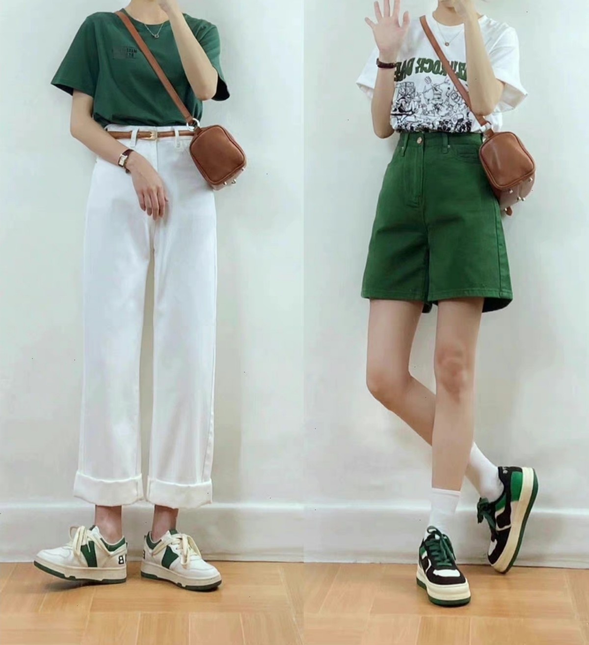 像這條綠色的短褲,這種色彩雖然不像大紅色一樣過分的張揚,但也能有別於黑色的平淡和白色的寡淡。搭配的T恤色彩不需要很亮眼,可以採用白色印花T恤,增加趣味性。
