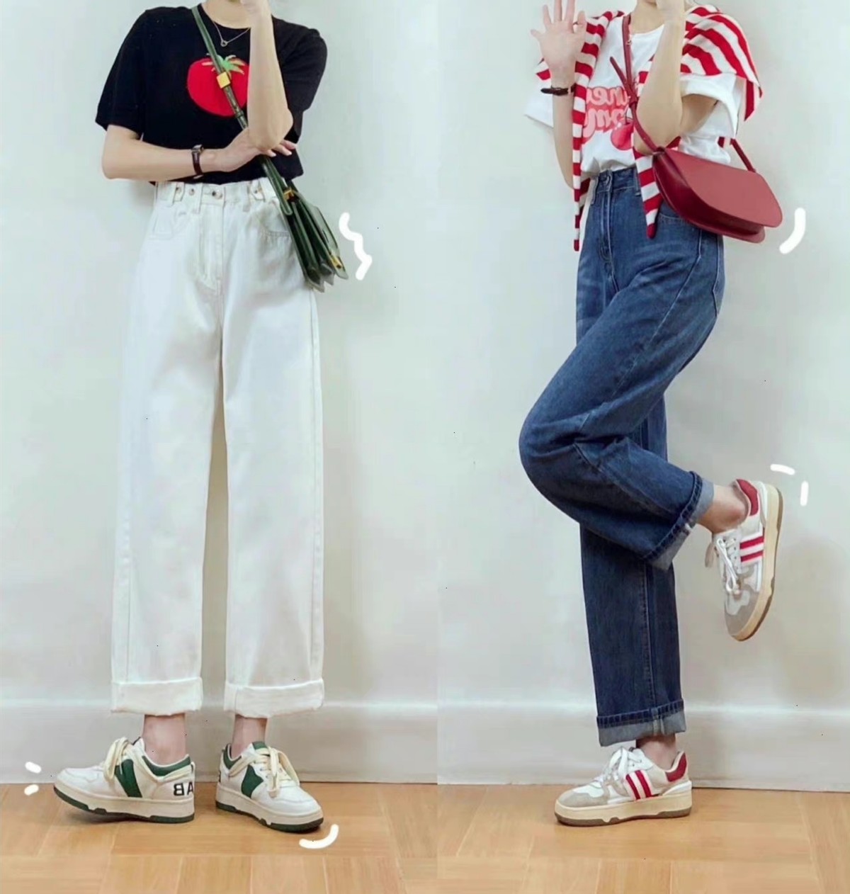 白色的寬鬆長褲,屬於夏日出場頻率極高的一大單品。它的輪廓不會過分的狹窄,留出一定的空間,讓腿部的一些不足掩蓋。搭配黑色的印花T恤,也很簡潔。