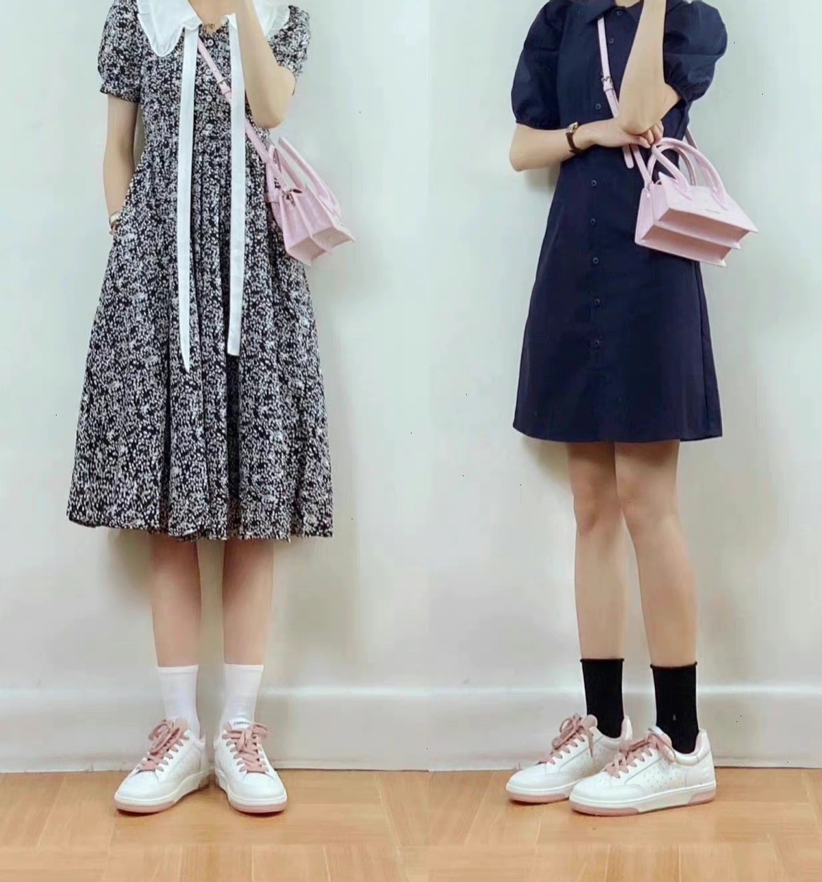 娃娃領設計的印花裙,它的外形會更加有特色一些,尤其和純色裙裝擺放在一起時,它所營造出來的造型更突出。但純色連衣裙也具備印花裙不具備的簡潔感和高級感,裙擺短一點,顯得身姿更輕盈。