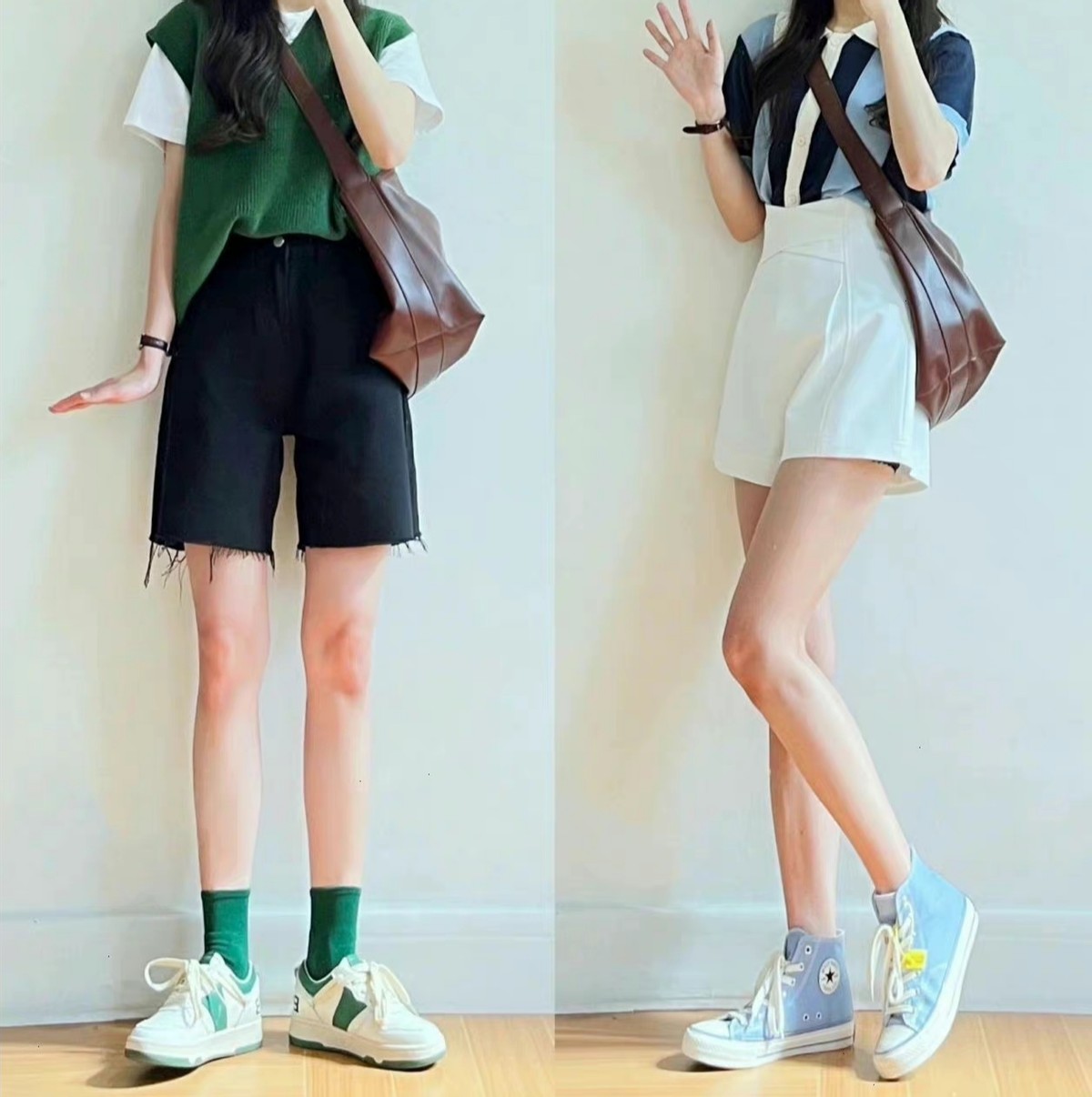 短褲的選用除了具備顏色的差距以外,在褲腿位置的設計也各有不同,最好選用稍微寬鬆一點的裁剪,這樣還能用來形成對比效果,襯托大腿的纖細。