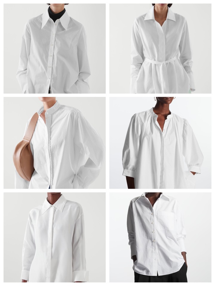 從日常單品看來,一件白襯衫就有許多款式,從最基礎的寬鬆版型棉質襯衫,到束腰、真絲、大廓形、荷葉邊、縮褶泡泡袖……