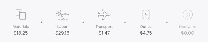 為此,Everlane 宣稱為經典產品選擇最好的材料和工廠,並通過減少廣告投放、減少中間環節等控制成本,再認真執行售價透明原則,公開原材料、勞力力、運輸等費用,以及合作工廠的條件。類似的 T 恤,在 Everlane 賣 15 美元,傳統零售則需 55 美元。
