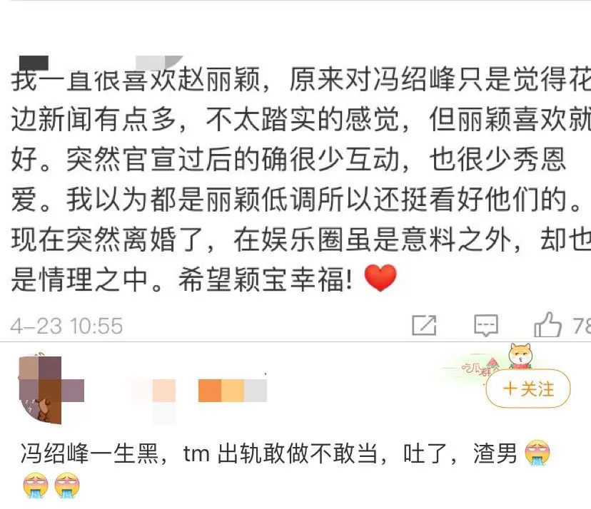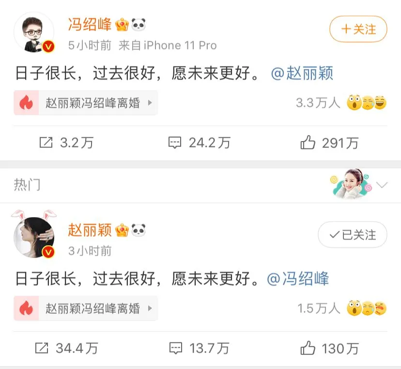 離婚消息霸占熱搜後,馮紹峰和趙麗穎先後在微博發文: