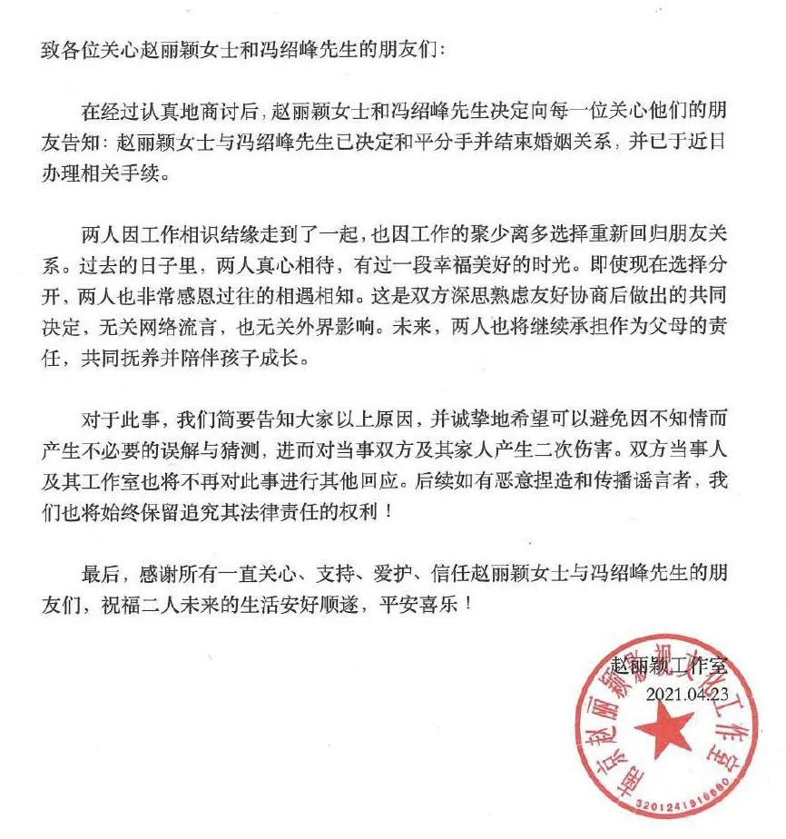 昨天趙麗穎工作室官方發布了#趙麗穎馮紹峰離婚#的聲明,炸了網友一個措手不及。