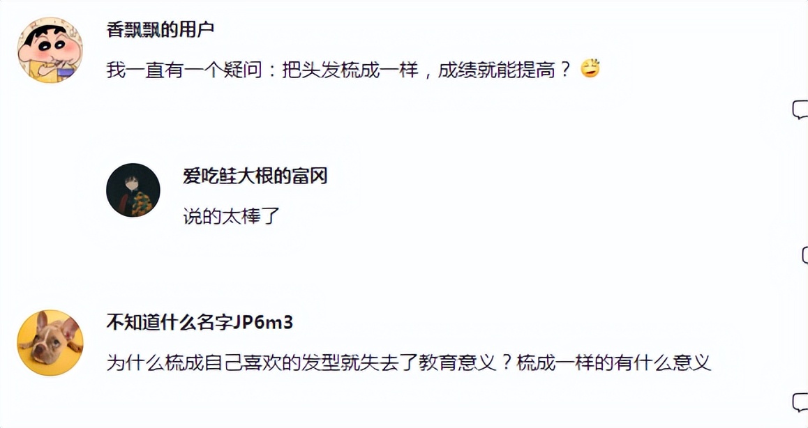 不過另一部分網友表示髮型對學習沒有直接影響,與其搞表面功夫,倒不如把時間花費在提高辦學水準上,而且國中生心思敏感,如果學校態度強硬,在髮型上較真兒,反而對有害學生的身心健康。