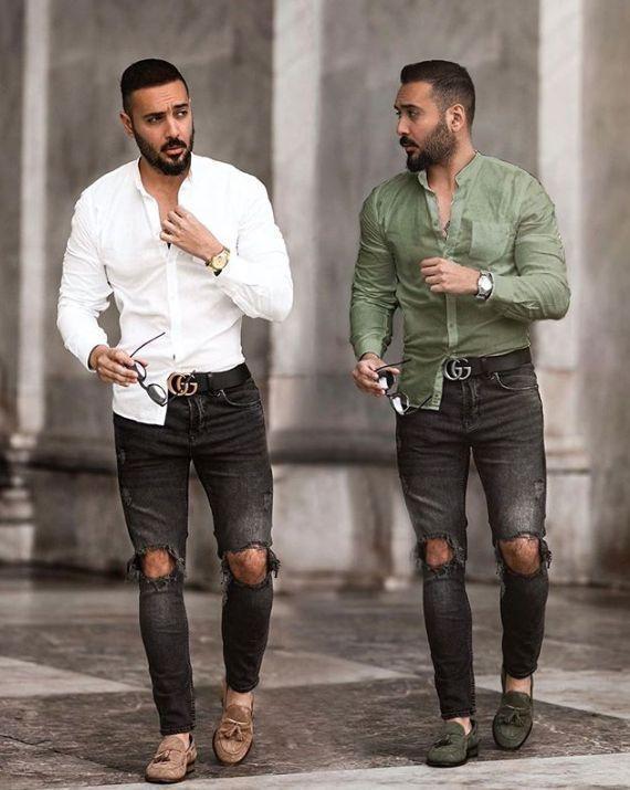 拿牛仔褲來說,市面上那些修身的版型雖然塑形,但並不適合中年男人,穿起來雙腿勒得緊緊的,黏膩且容易丟失男子氣概。還要切記避免穿大破洞,帶有各種貓須、刺繡、補丁元素的牛仔褲,大面積露膚看起來很不得體!