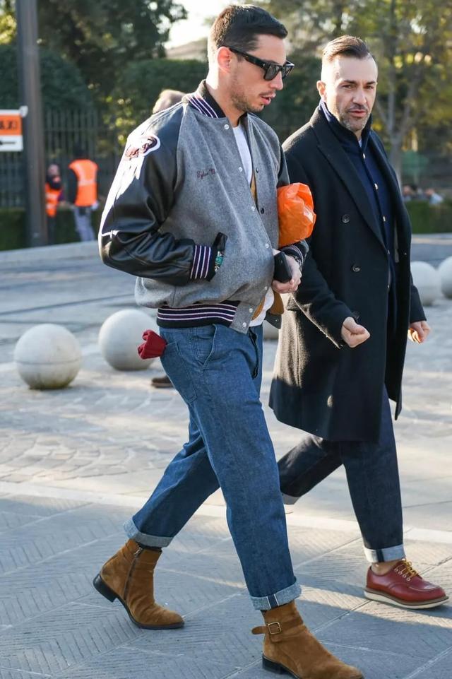 牛仔褲搭配靴子時,盡量選擇直筒版型或九分褲型,因為寬腿褲或闊腿版型搭配靴子容易顯腿短。另外,這種搭配不適合小個子,僅適用於腿長且個子高的中年男性,更有助於凸顯紳士高級感。