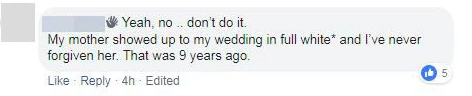 之後就有人建議她不要穿著純白的禮服去婚禮現場,其中有一個人是這麼說的:「我媽來參加我的婚禮的時候,穿了一件全白的禮服,這之後我就再也沒有原諒過她。到現在已經有九年沒和她說過話了。」▼