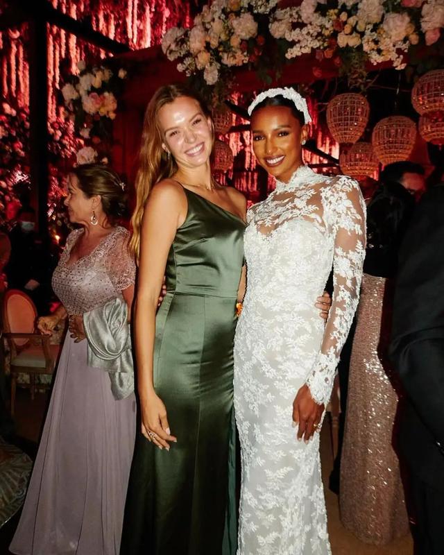 超模的伴娘團顏值水準都很高。婚禮上,超模Sara Sampaio、Kelsey Merritt作為伴娘出現,身著來自Mumu Wedding的鼠尾草綠色緞面禮裙。