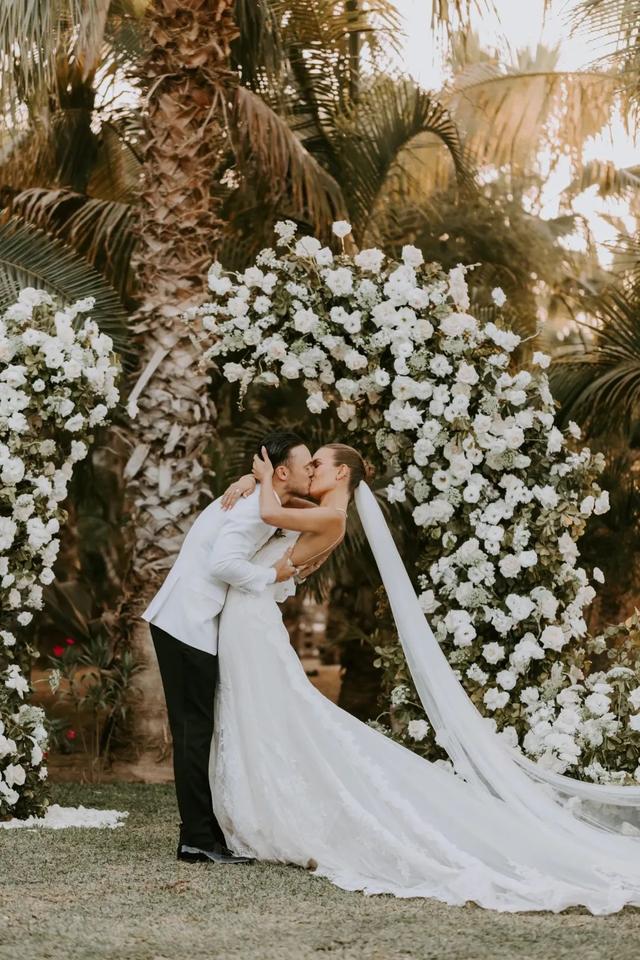 日落時分,由鮮花裝扮的棕櫚樹下,這對新人在親友們的祝福和見證下宣誓和親吻,完成了婚禮儀式。