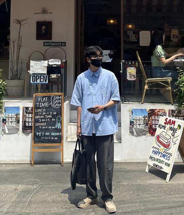 喜歡更加低調一些,不妨試試這款淺藍色襯衫,搭配深灰色西褲,簡單舒適又很好駕馭!