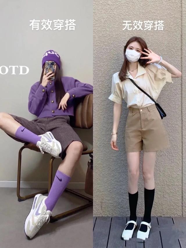 其實有效穿搭對於整體色彩的呼應感,對比度,以及色彩的敏感度,都是非常考究的。紫色針織衫與中筒襪,色彩感更強,配棕色短褲也清新時尚,在人群中更加吸睛。