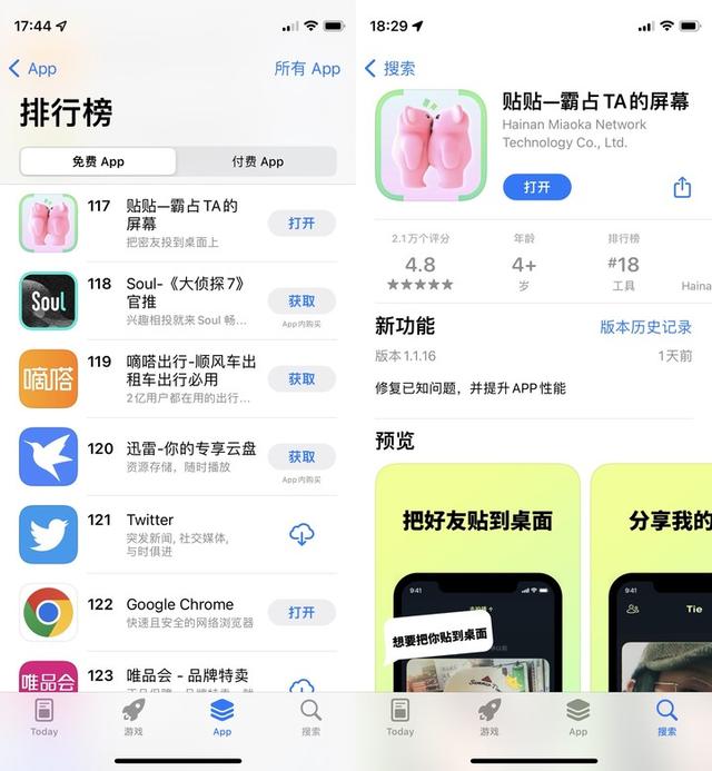 事實也正是如此,截止至發稿前,《貼貼》在 App Store 已經擁有 2.1 萬個評分,在免費榜中排名第 117 位。