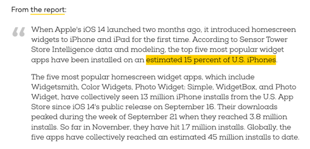 2020 年 9 月 16 號,蘋果發布 iOS 14 系統。同年 11 月 Sensor Tower 就發布報告稱,有 15% 的美國用戶的下載過排名前五的小組件應用(分別為 Widgetsmith, Color Widgets, Photo Widget: Simple, WidgetBox, and Photo Widget)。
