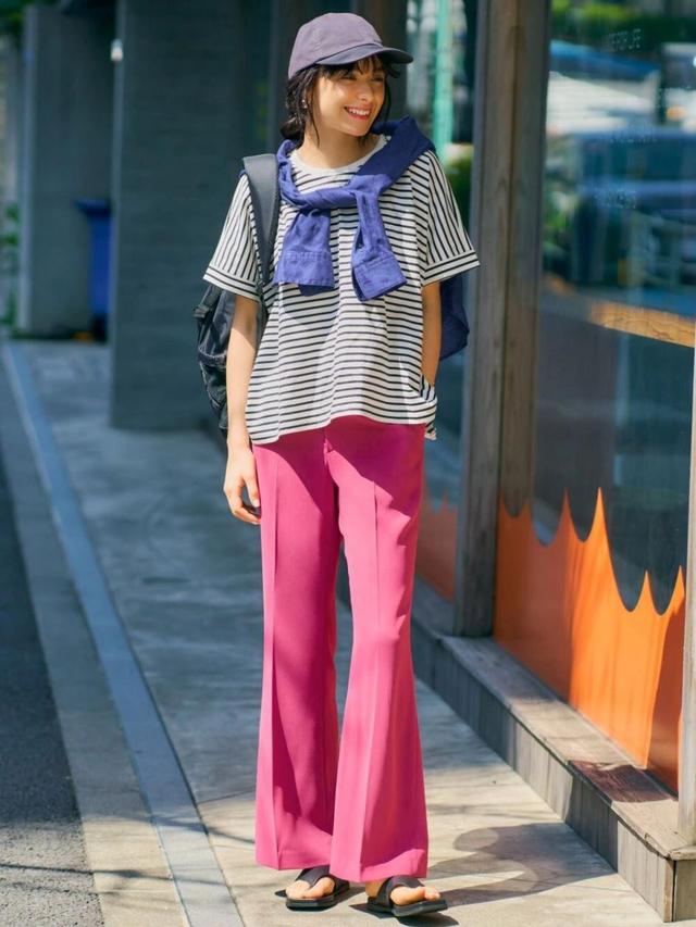 下面這種條紋T恤的穿搭就很個性,黑白色條紋簡單經典,配上玫紅色的喇叭褲,這樣的穿搭也非常具有個性,獨特顏色和剪裁的褲裝提亮了這一身造型,和條紋衫的結合非常有層次感。
