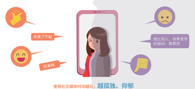 社交媒體就像一把雙刃劍,一方面幫助年輕人拓展了朋友圈,以更迅捷的方式與外界保持聯絡,和親朋好友分享資訊,更充分地展示自己。與此同時,社交媒體也弱化了使用者真實的人際交往,讓人與人之間的關係更加疏離,讓人更易感到孤獨。