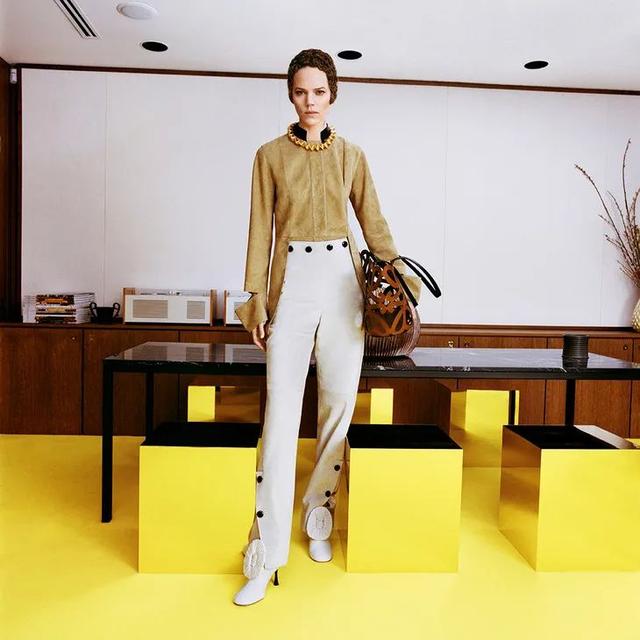 剪裁一直都是Jonathan Anderson著力探討的設計點,這一季著眼於棉質結構。版型的拉伸呈現出上世紀20年代馬術服的既視感,大量麂皮夾克則用中性設計表達力量,同時還探索了面料與裝飾物的組合方式增強造型感。