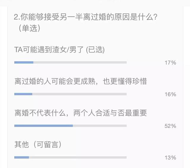 而在「能接受另一半離過婚」的人裡,也有17%認為前任可能是個人渣,另一半運氣不好。
