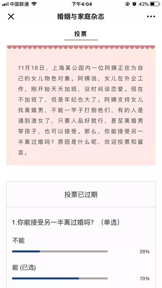 很快,《婚姻與家庭》雜誌就在各大平臺啟動了一項調查,題目就是:你能接受另一半離過婚嗎?2675人參與了本次調查,結果,70%的人斬釘截鐵地表示:能!這些乾脆利落的聲音說明時代真的已經變了,人們不再對離婚人士持有偏見,而是以理解的態度去看待他們的過往經歷。
