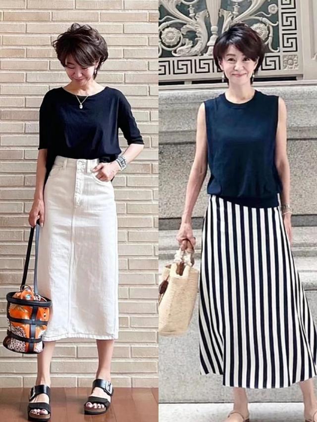 這一公式有很多形式,例如用黑色短袖衫匹配白色高腰牛仔長半裙,又或者用黑色無袖衫匹配黑白豎紋長半裙,簡約不沉悶,耳飾、項鏈、包包都起到了裝飾效果。