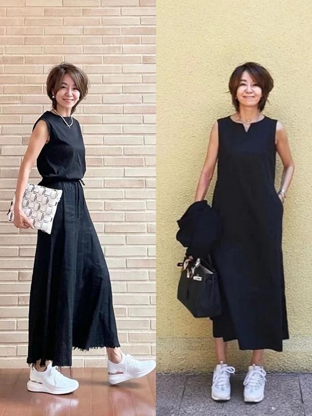 黑色膝下裙簡約又能體現50歲女生的神秘與高貴,大家可以安排起來,在搭配上建議組合白色平底球鞋,輕鬆驅散沉悶感。