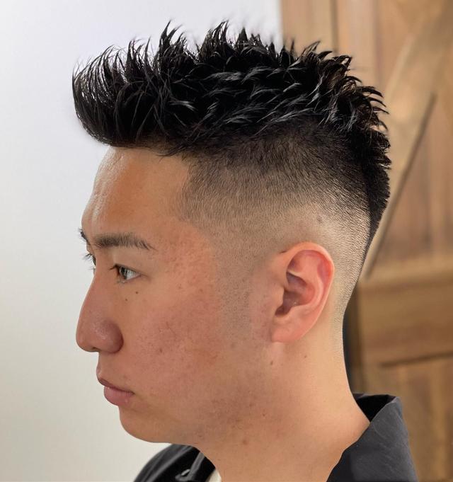 前刺飛機頭:前刺指的是頭髮剪短後,用啫喱膏打理出類似刺蝟狀的效果,飛機頭指的是瀏海的造型,就是上圖中這種效果。這種髮型適合發質粗硬的男士,兩邊和後面鏟青,頭頂按照平頭的方式剪短,把發梢用牙剪打薄,塗點啫喱膏或發蠟,就可以梳理成這種效果,非常帥氣又精神的髮型。