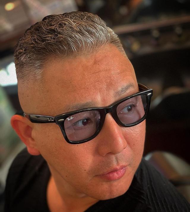 自然斜背頭:斜背頭指的是頭髮的紋理從前向著斜後方梳理,形成斜向的紋理。如圖片中這位男士的髮型,兩邊鏟青,頂部剪短,梳理成斜背的造型,不僅幹練,也非常顯年輕。圖片中這位男士,白髮較多,如果留長髮的話白髮會顯得更多,兩邊後面鏟青,大部分白髮就看不到了,即便頭頂有少許白髮,只要把造型打理出來,也不會顯老,反而更酷。