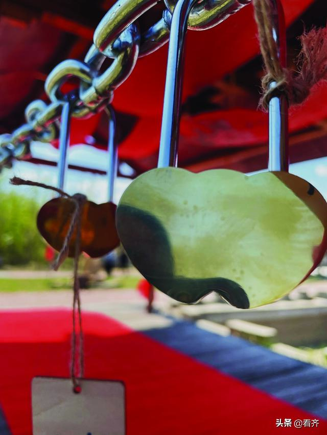 記者站在「滿族大院」的大門口,放眼望去,院內青青草地映襯著藍天白雲,美不勝收。秦先生牽著妻子的手進入大門,首先來到了少數民族文化長廊,在這裡情侶們可以鎖上一把「同心鎖」,預示著二人的心永遠在一起,並在幸福牆上留下自己的名字,取「幸福到永遠」之意。