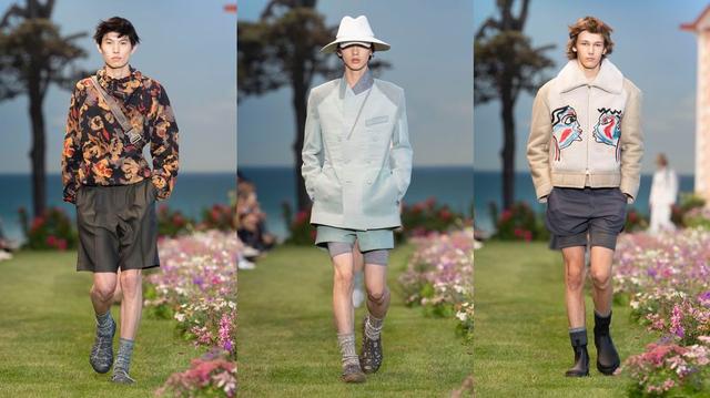 Dior(Dior)2023夏季男裝延續經典Dior套裝(BAR JACKET)廓形設計,用半透明歐根紗重塑男士硬朗的正裝造型。以回收羊絨制成的雙排扣精裁大衣,搭配借鏡自一九三零年代款式,並飾有束腰的短褲,與休閒鞋履搭配,以體現現代摩登感。