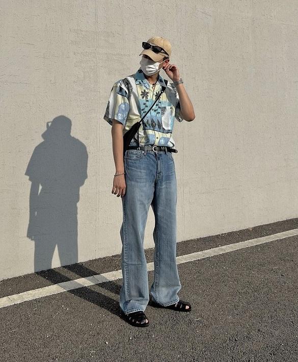 同色系穿搭,也是夏季比較推薦的穿搭思路。夏威夷風情短袖襯衫,搭配牛仔直筒褲,不僅拉高身材比例,同時延伸腿部線條。簡約帥氣,適合高個子男生嘗試。