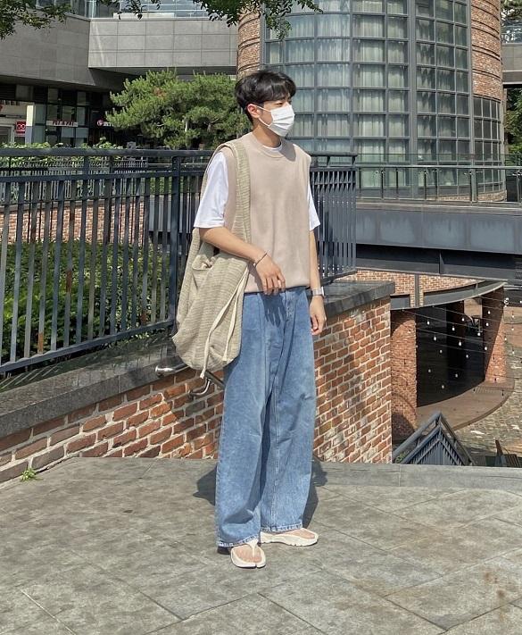 白色T恤搭配淺棕色背心,簡約帶有層次。搭配一條藍色闊腿褲,整體色彩搭配和諧,舒適又時髦。
