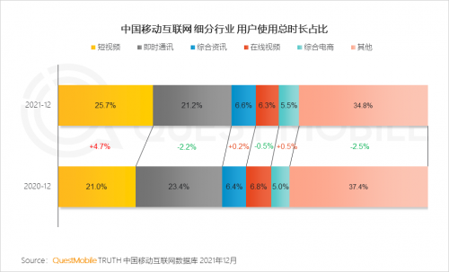 同時,網民們內容消費時長還在增長,電商平臺通過內容提升在線時長的策略是比較明智的。根據QuestMobile2021大陸移動互聯網年度大報告,從2020年到2021年,短視訊、綜合資訊、在線視訊等內容使用總時長均在提升,其中短視訊已經正式超越即時通訊,成為互聯網時長的最大占據行業。