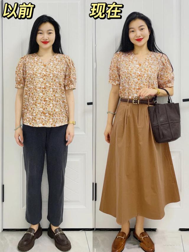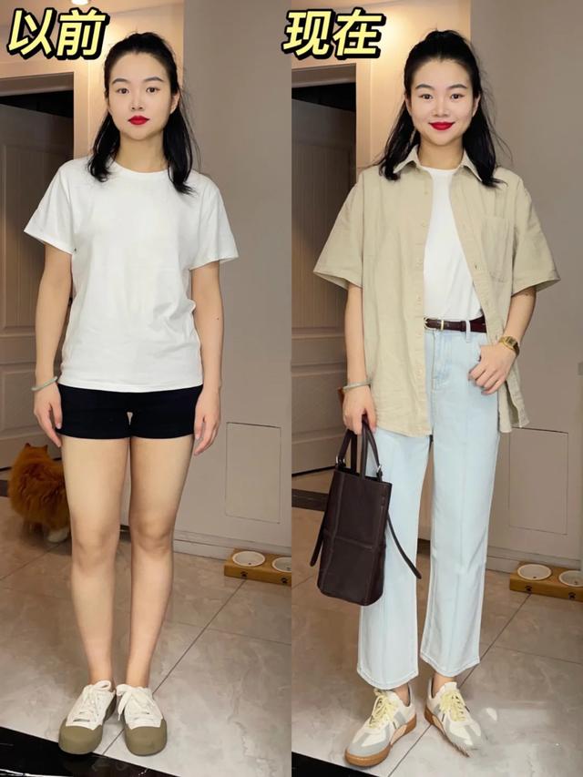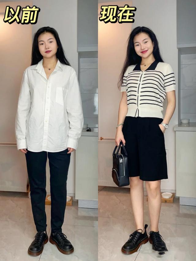 這位博主在以前的穿搭中,也不是很懂得揚長避短。其實這位博主屬於典型的梨形身材,如果用寬鬆的襯衫搭配小腳褲,剛好暴露胯部粗壯感,視覺上沒有那麼協調。