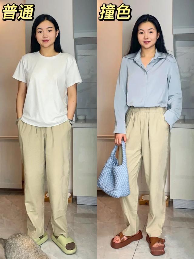 現在的穿搭更加善於運用撞色的組合,清爽的藍色襯衫,配卡其色的高腰直筒褲,踩一雙棕色厚底拖鞋,竟有了時尚又吸睛的氣氛感。尤其是藍色手拿包與藍色襯衫呼應,整體感更加協調。