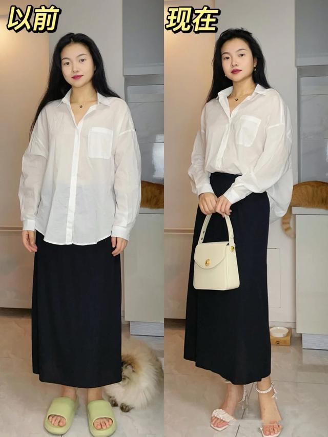 相對於以前的穿搭,這位博主顯得穿搭則時髦洋氣得多了。清爽的白色襯衫,還是配高腰的黑色半身裙。但選擇一種塞衣角的方式,形成了一種前短後長的效果。尤其是搭配了同色的高跟涼鞋和手提包,精緻氣氛拉滿。