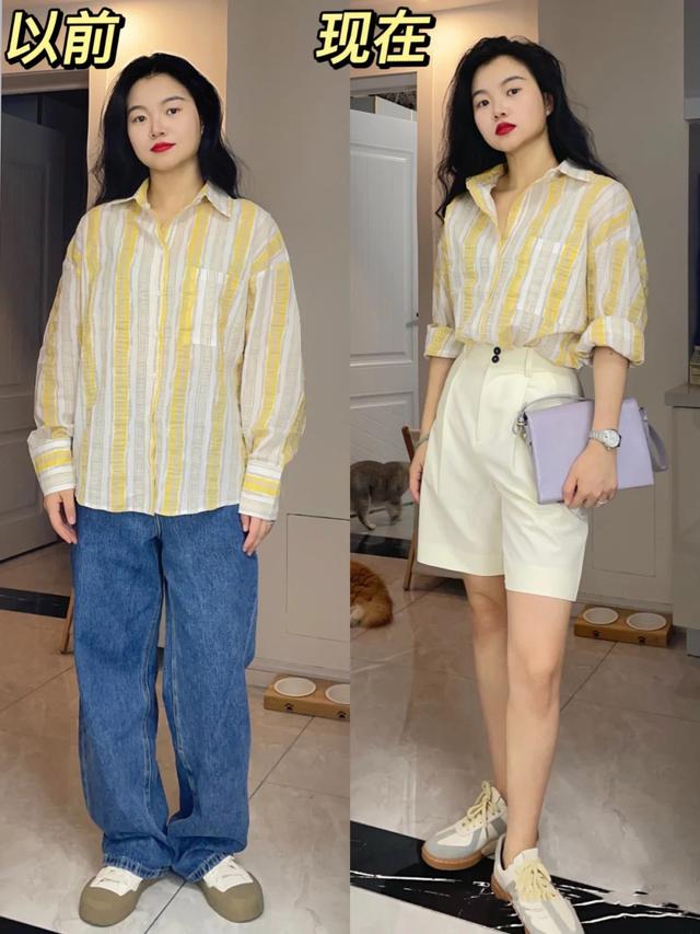 這位博主現在的穿搭,明顯的有了一定程度上的改進。同樣的黃藍條紋襯衫,配上清爽的白色直筒短褲,特別的利落幹練,也修飾了腰胯部的壯碩感。
